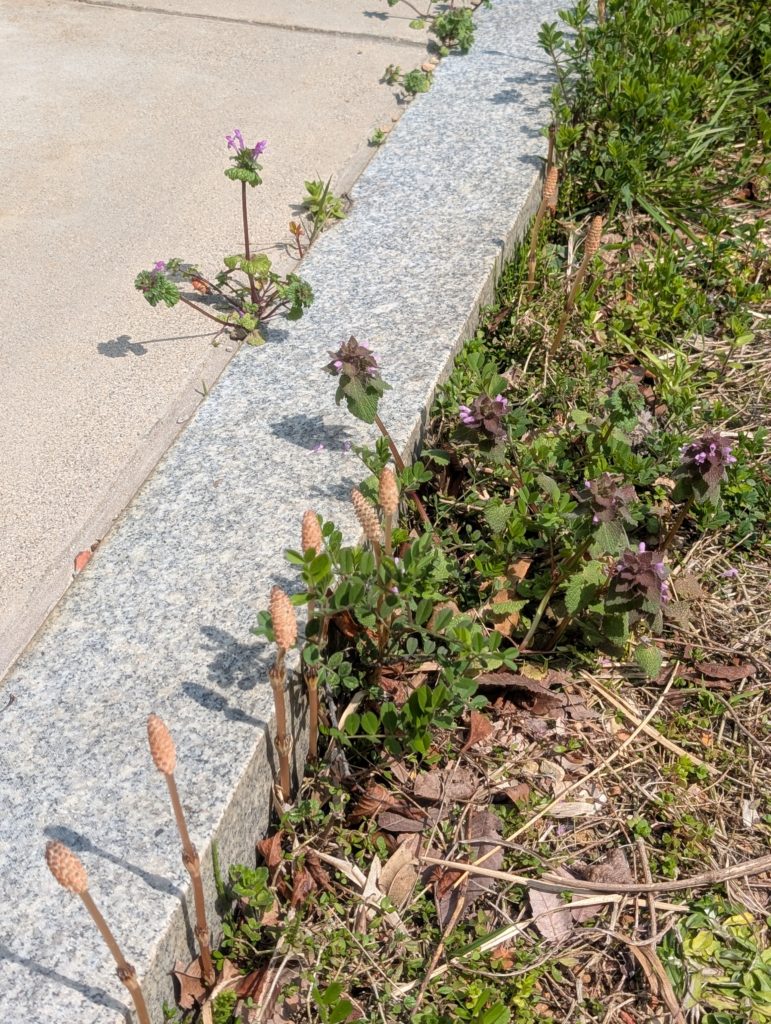 我が家の庭に春が来ました。つくしとホトケノザとヒメオドリコソウが咲いてます。
